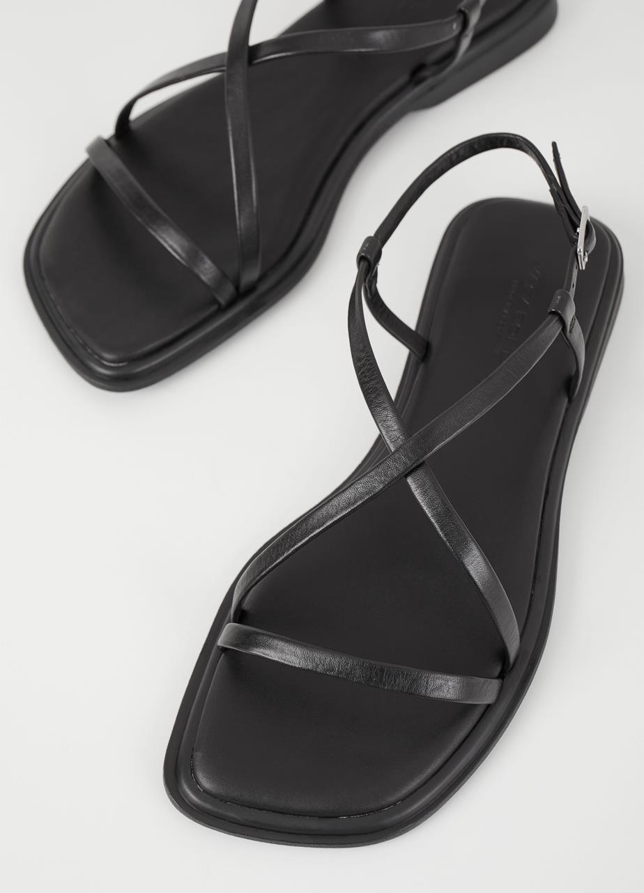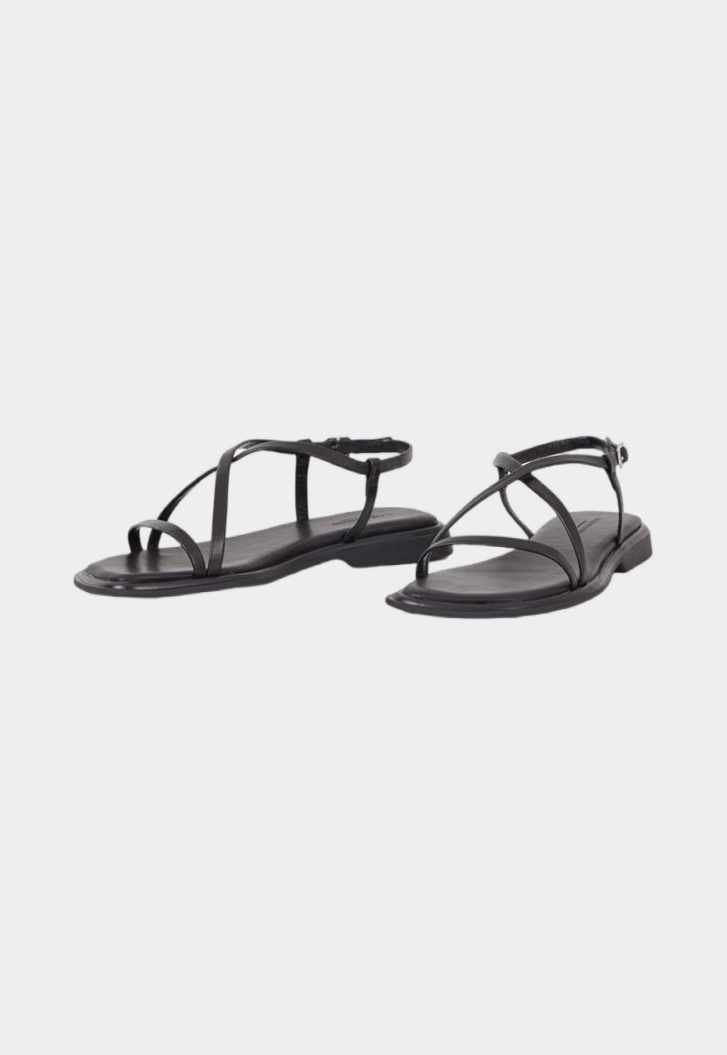 סנדלים לנשים מבית המותג ואגבונד. סנדלים מינימליסטיים עם מראה אלגנטי ונקי. הדגם מעור שחור עם רצועות דקות מוצלבות, רצועת עקב מתכווננת וסגירה עם אבזם כסוף. בעלי סוליה דקה ורפידת עור פנימית לנוחות מירבית. גובה הסוליה: 2 ס"מ.