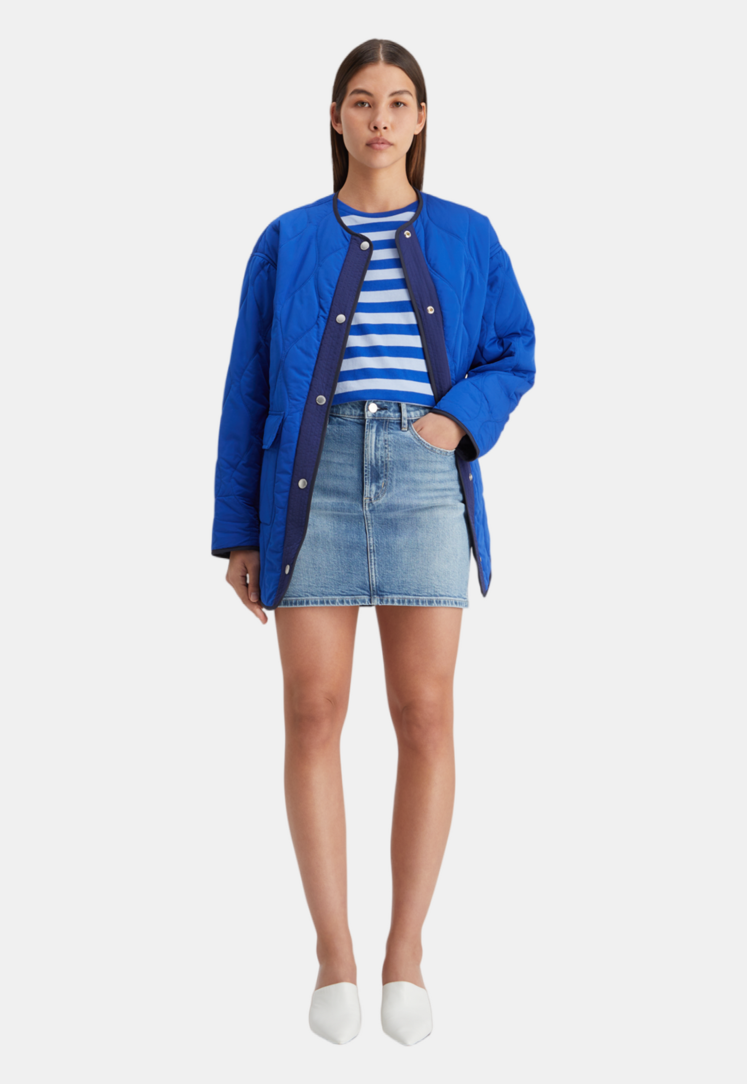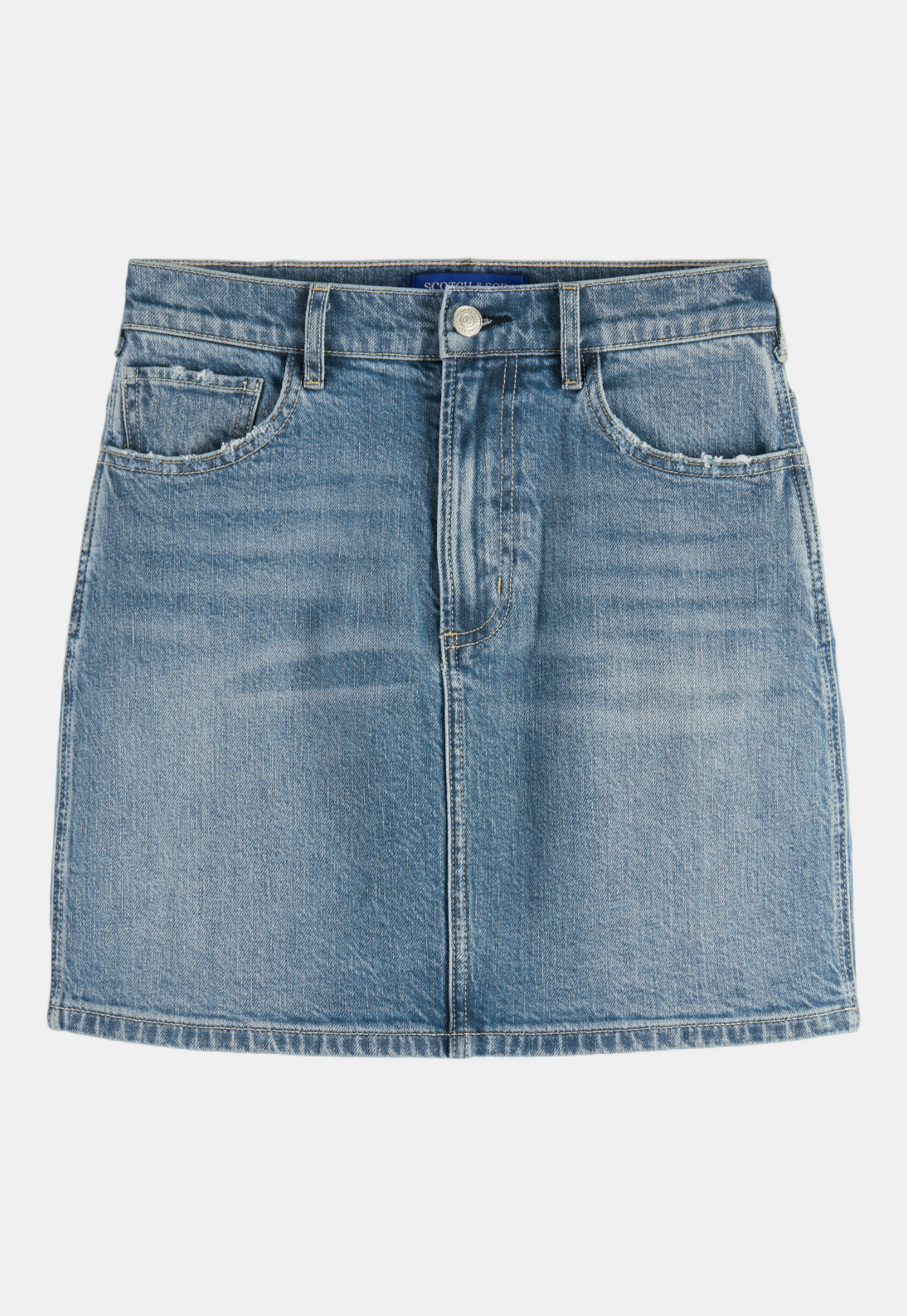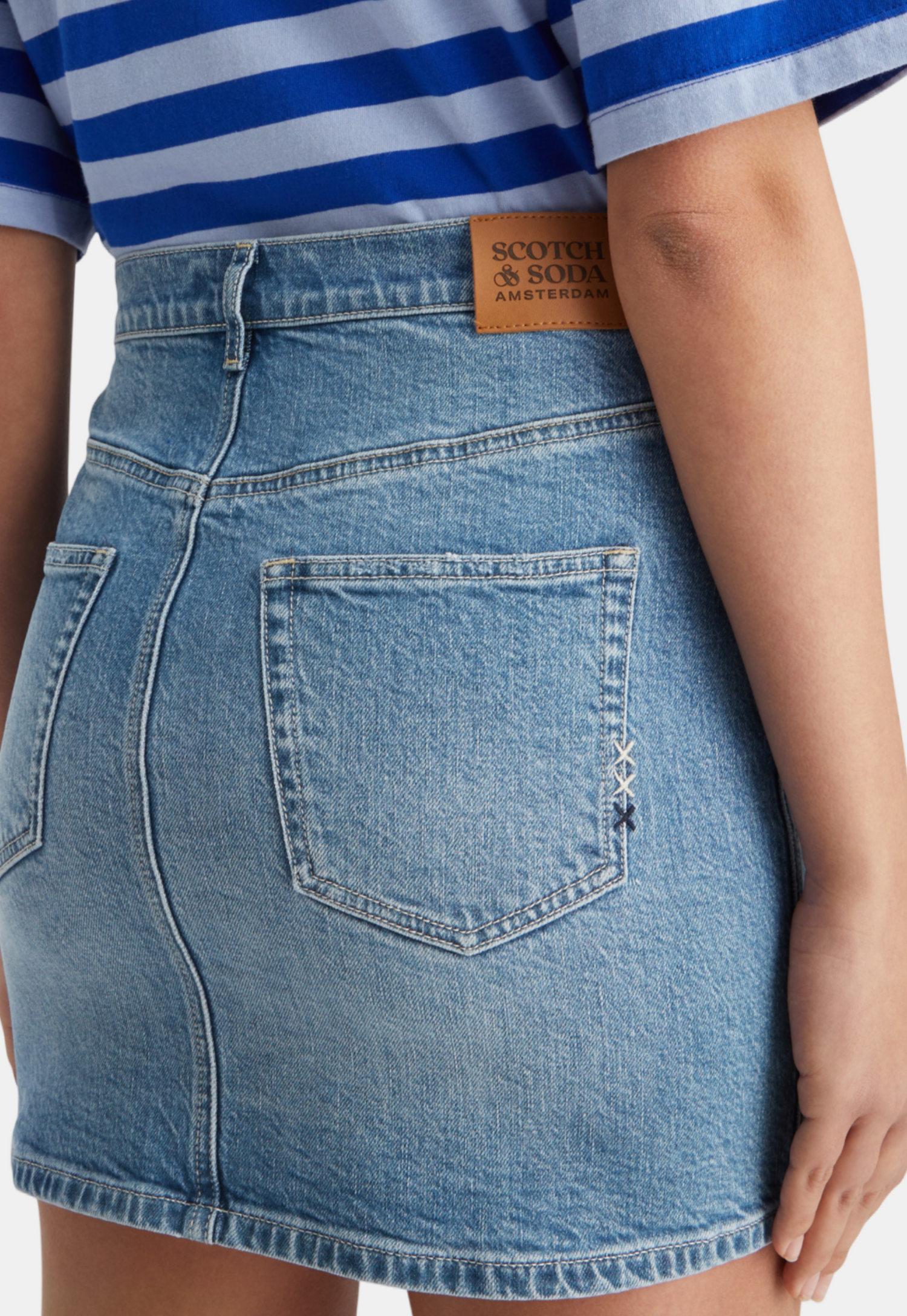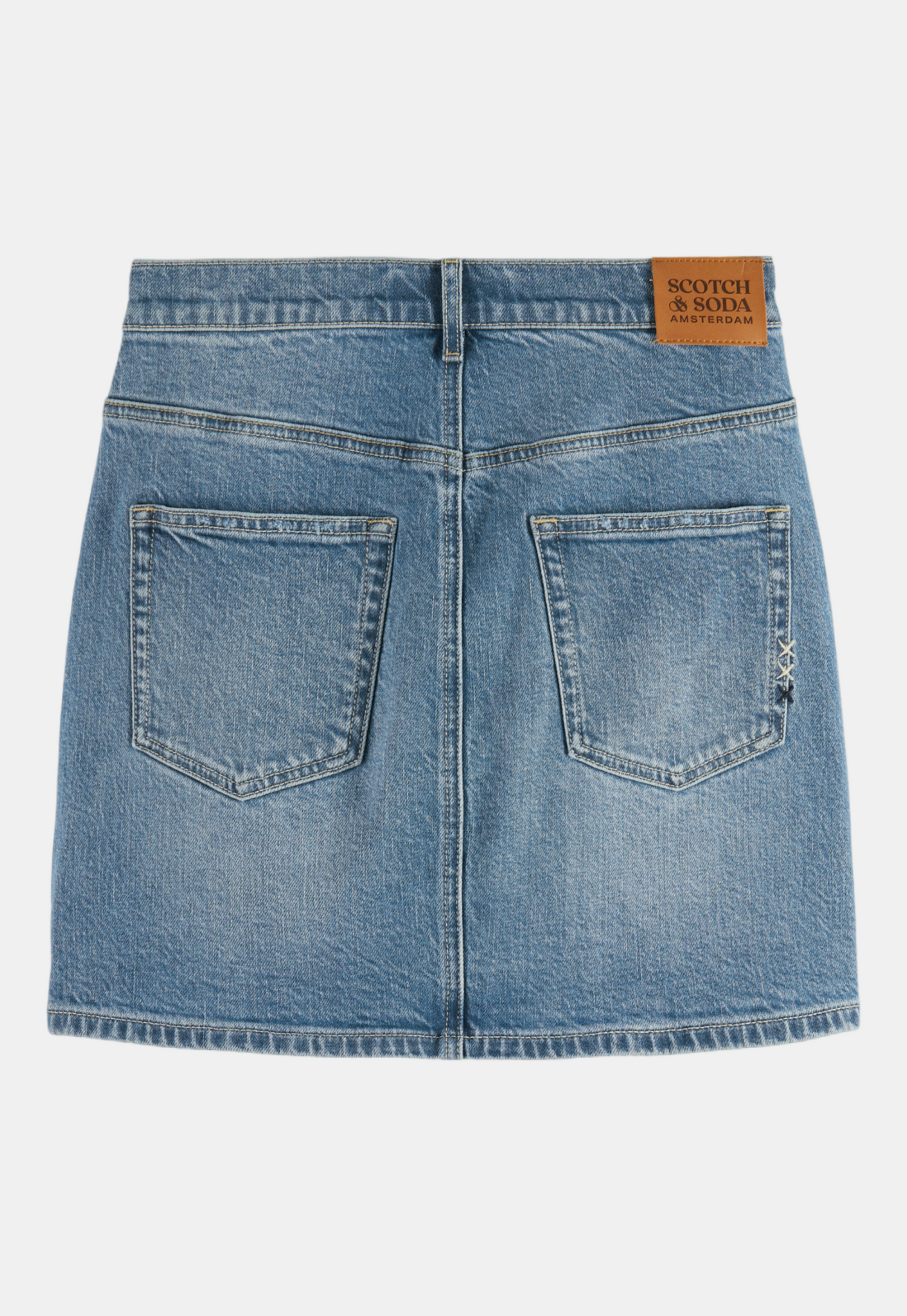 חצאית מיני ג'ינס לנשים מבית המותג סקוצ' אנד סודה. גזרה צמודה וגבוהה עם רוכסן סגירה וכפתור, שני כיסים קדמיים ואחוריים.