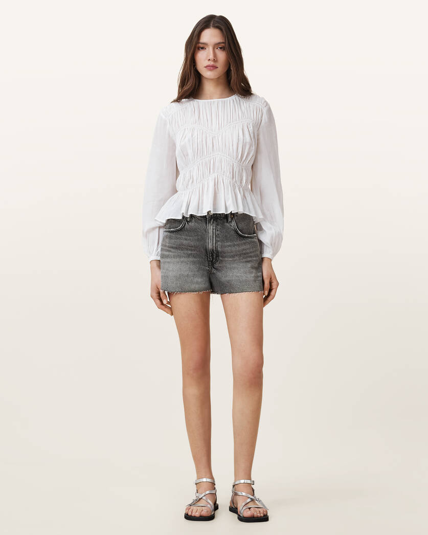 ג'ינס קצר לנשים מבית המותג אולסיינטס. בגזרה קלאסית, עם רוכסן וכפתור סגירה, שני כיסים קדמיים ואחוריים וסיומת פרומה. בשטיפה אפורה.