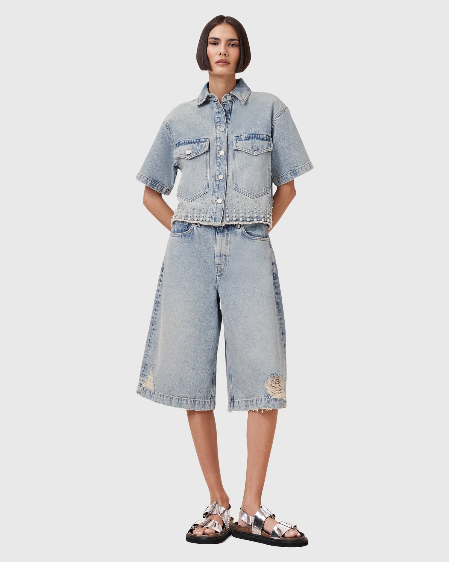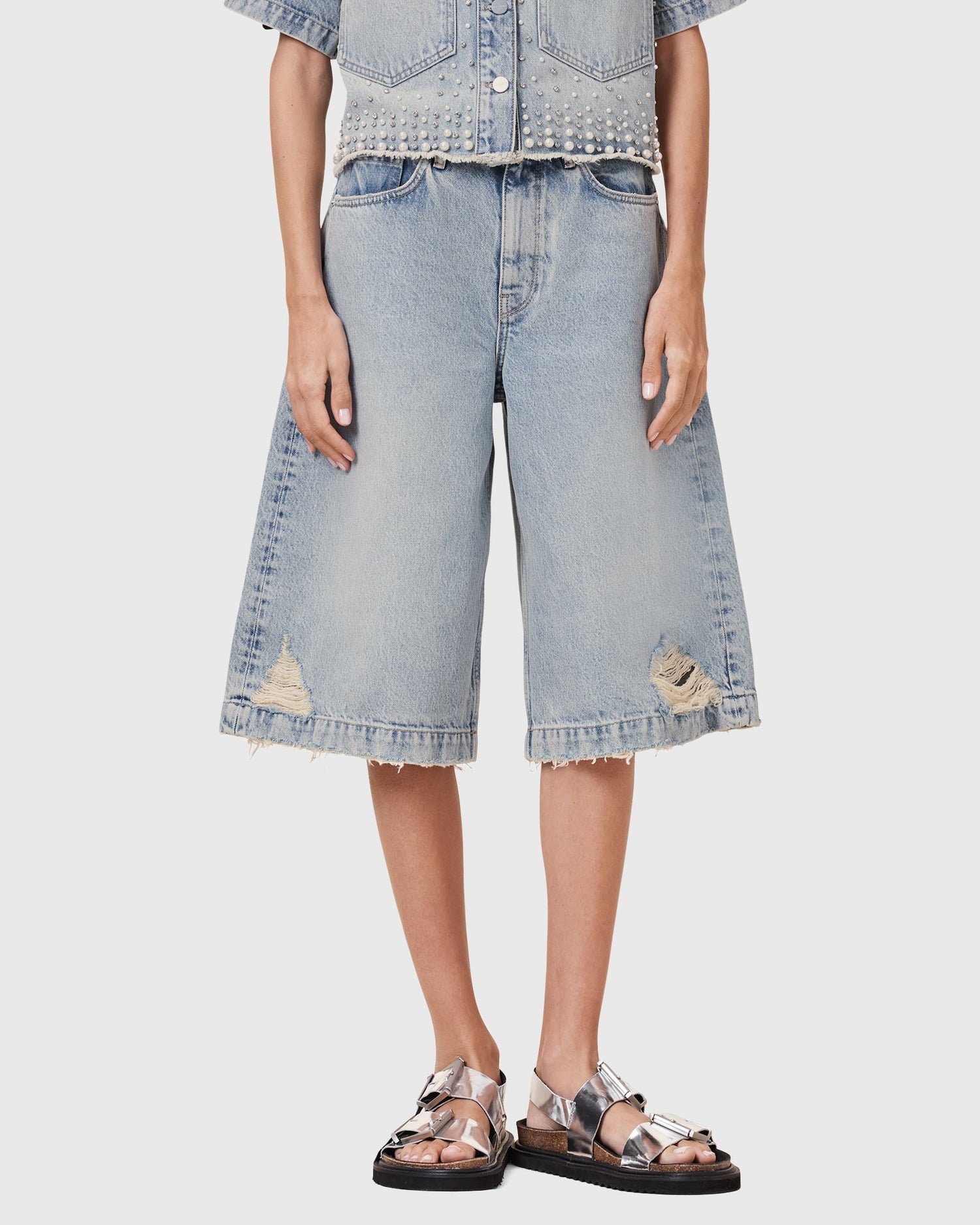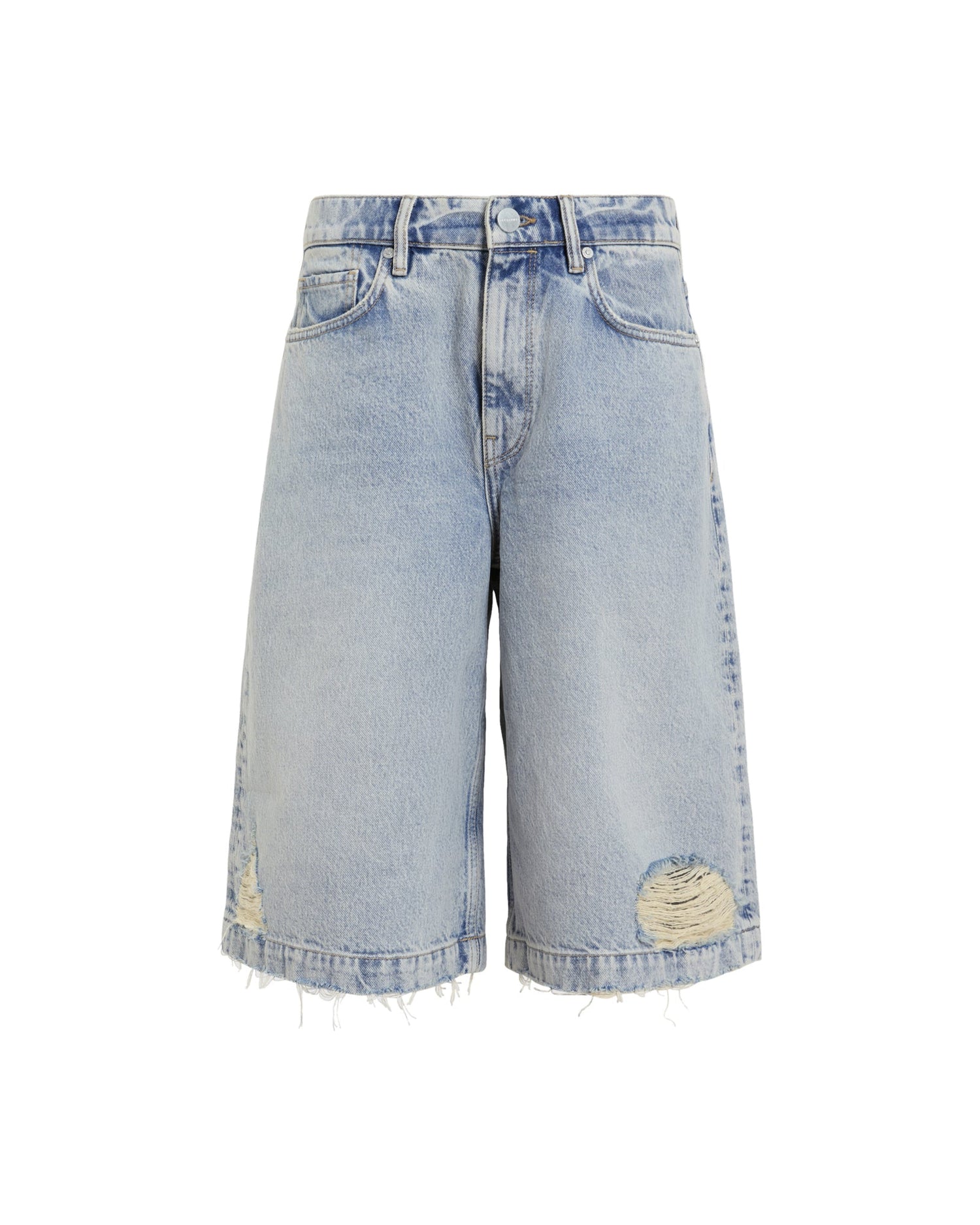 ג'ינס ברמודה לנשים מבית המותג אולסיינטס. בגזרה רחבה, אורך עובר את הברך, עם קרעים בסיומת, סגירה רוכסן וכפתור. בשילוב שני כיסים קדמיים ואחוריים.
