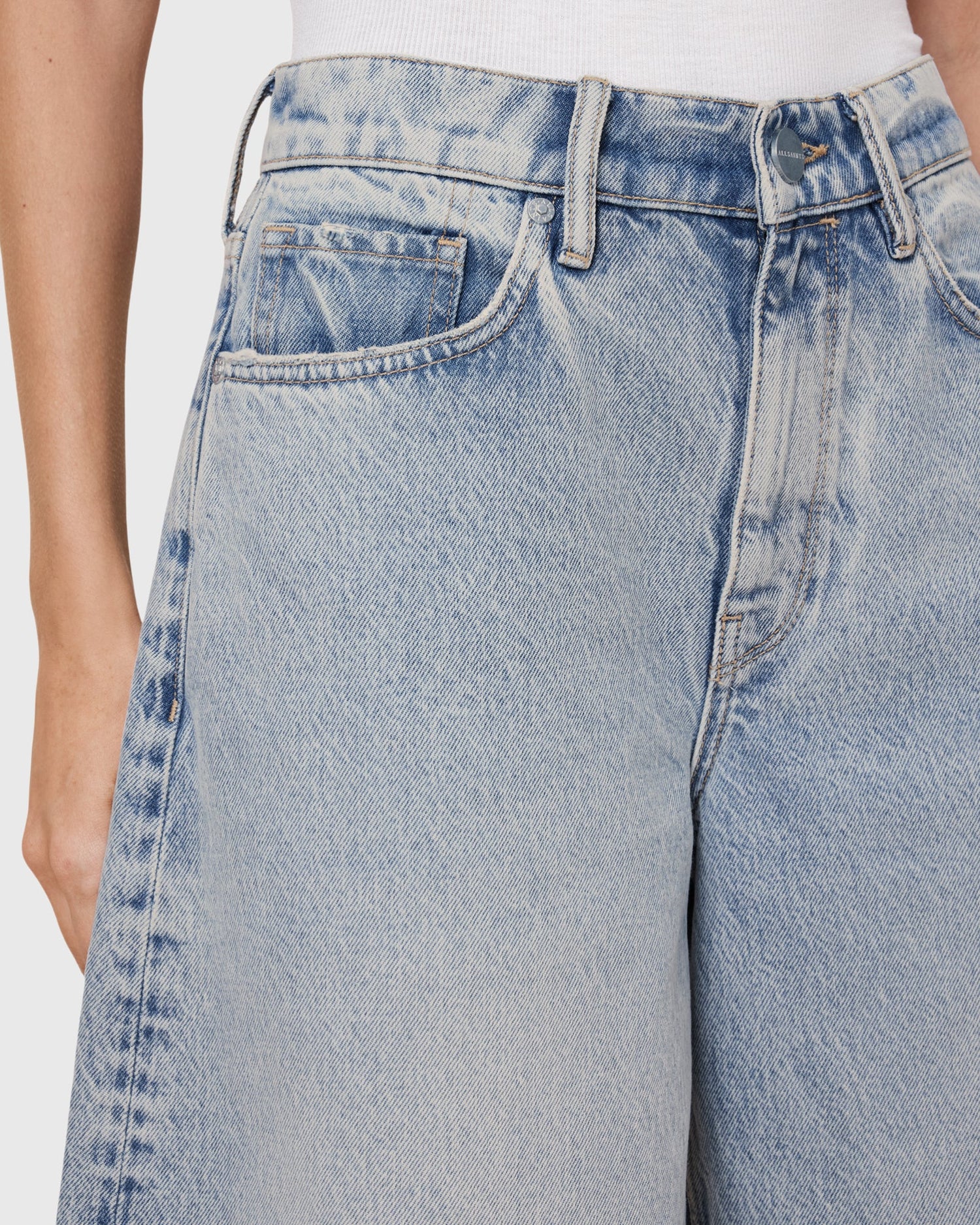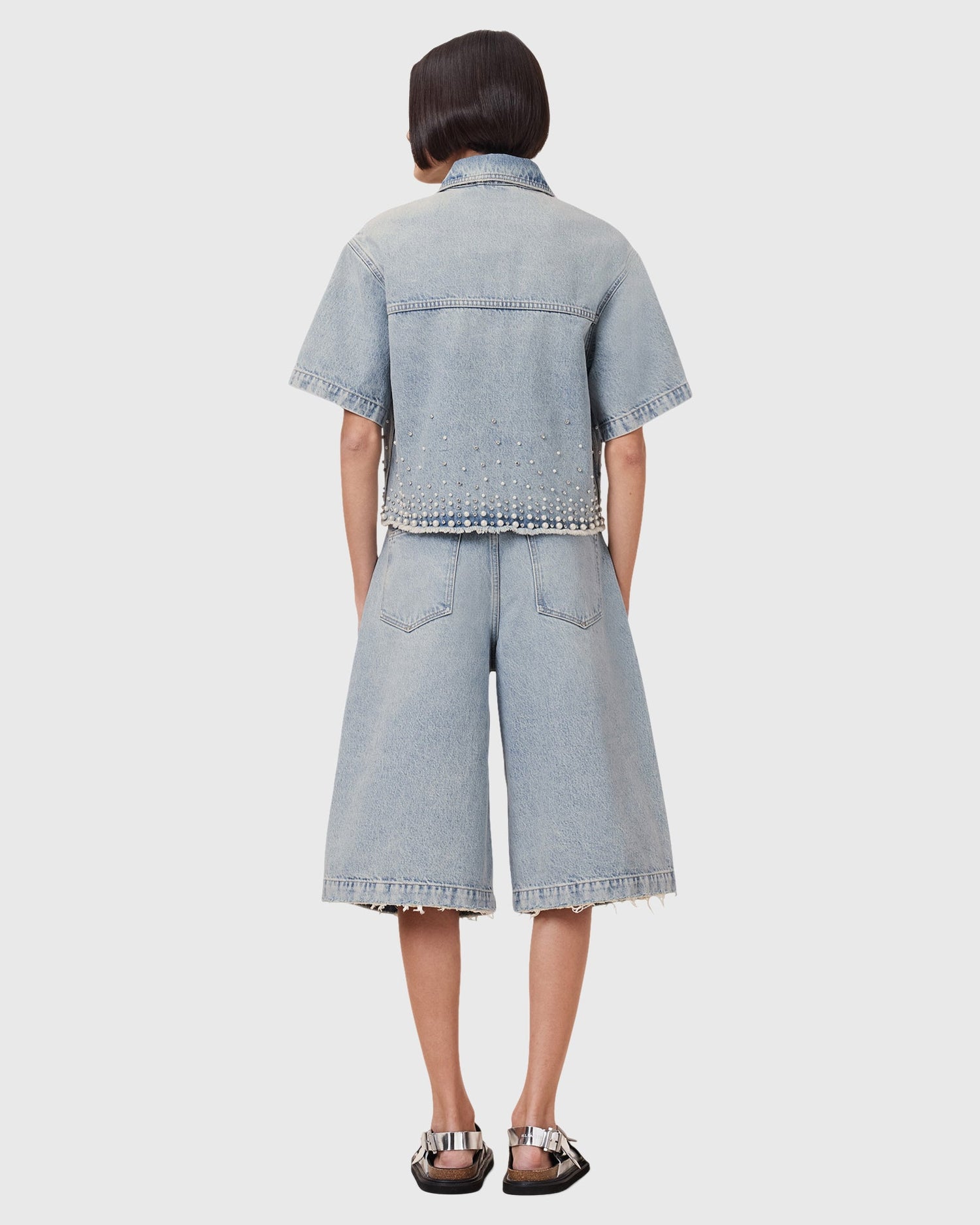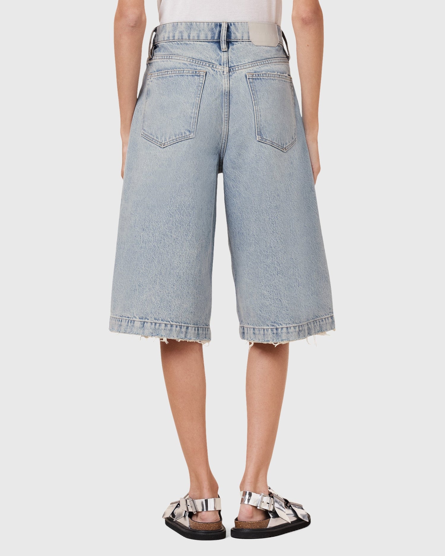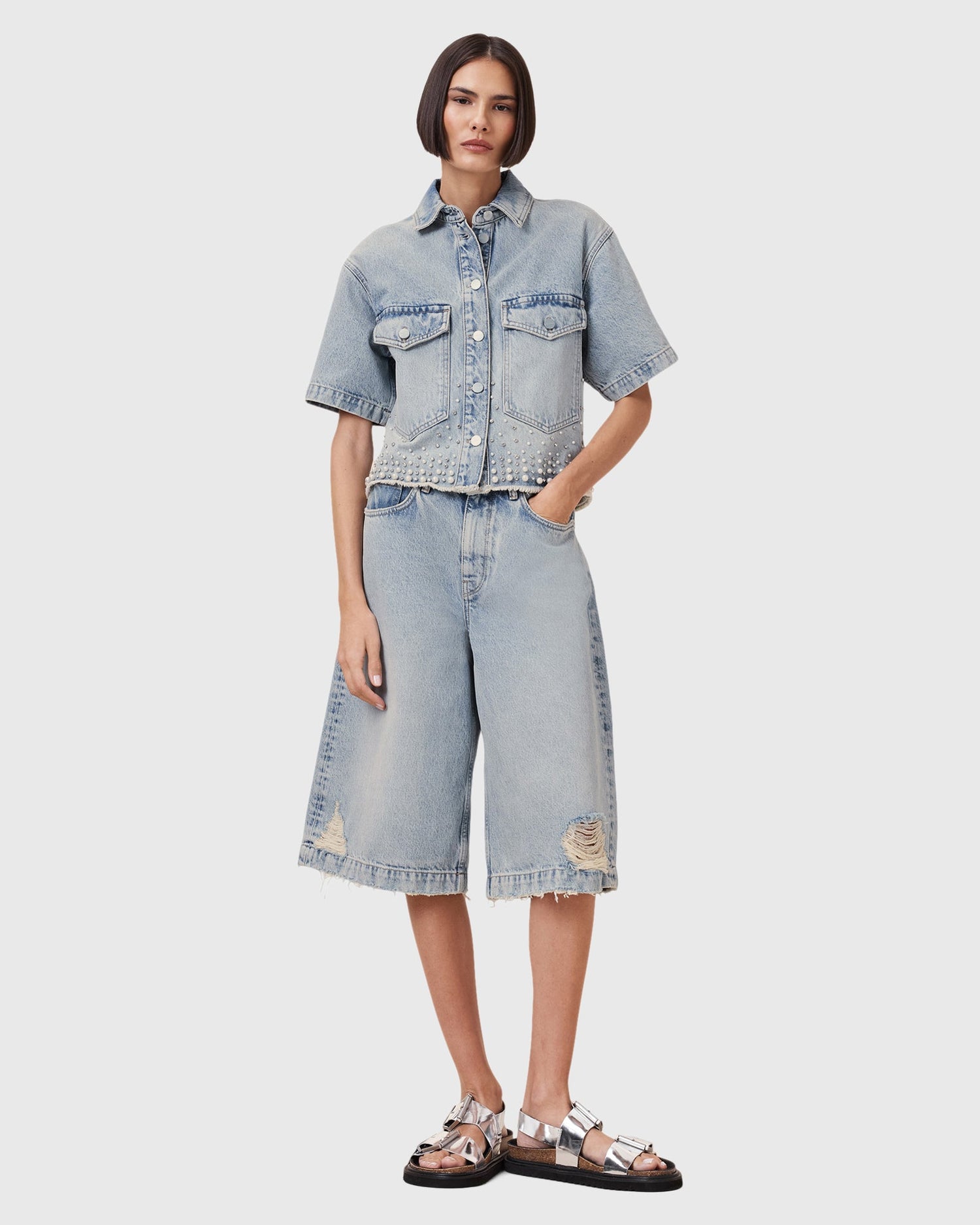 ג'ינס ברמודה לנשים מבית המותג אולסיינטס. בגזרה רחבה, אורך עובר את הברך, עם קרעים בסיומת, סגירה רוכסן וכפתור. בשילוב שני כיסים קדמיים ואחוריים.