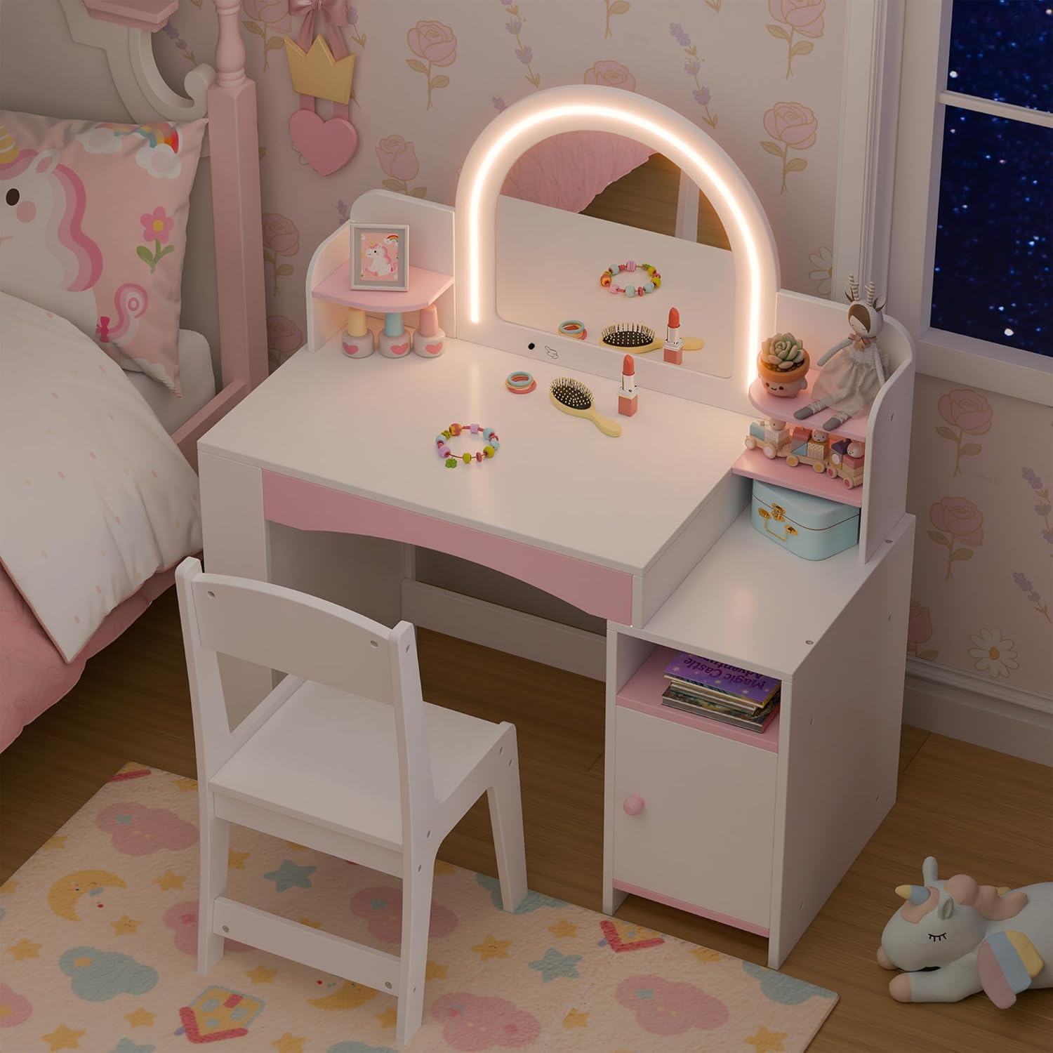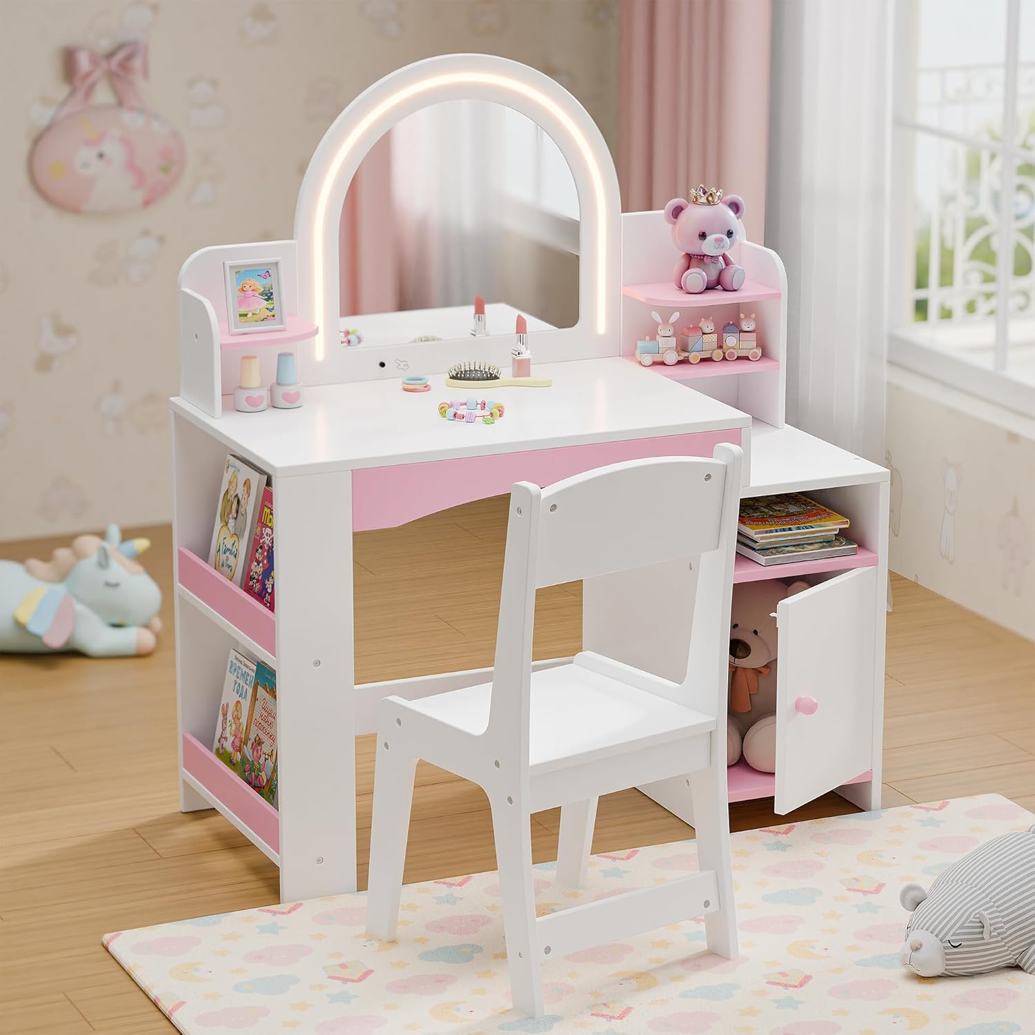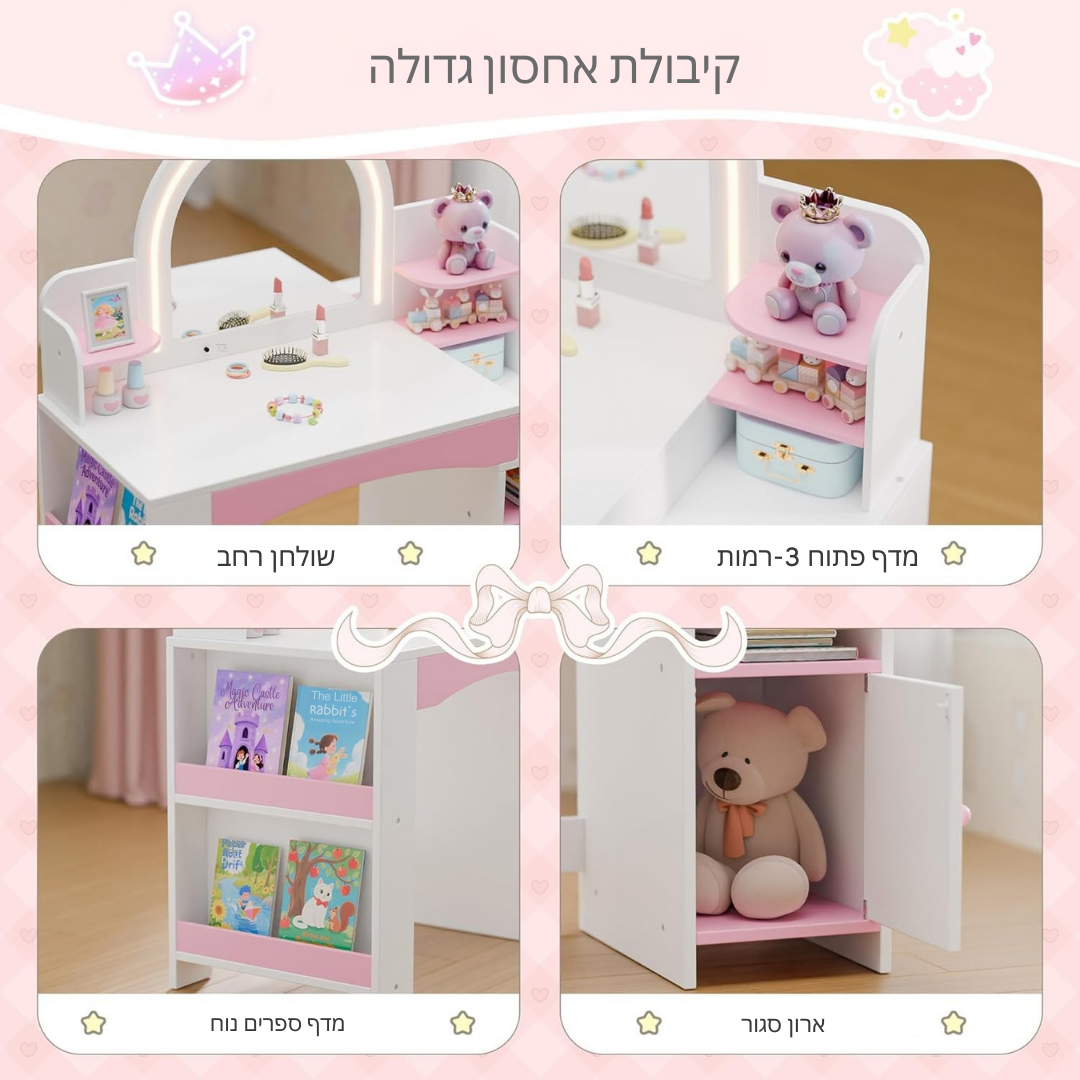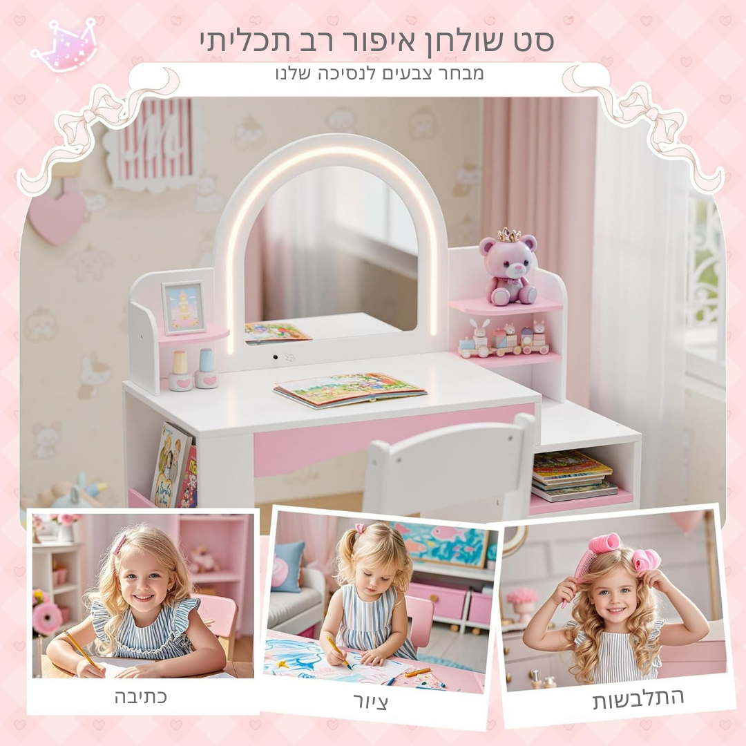 ™Kaleya | שולחן איפור לתינוקות – מראה מואר, מדפים 3 קומות, ארון, סטולים לבנות