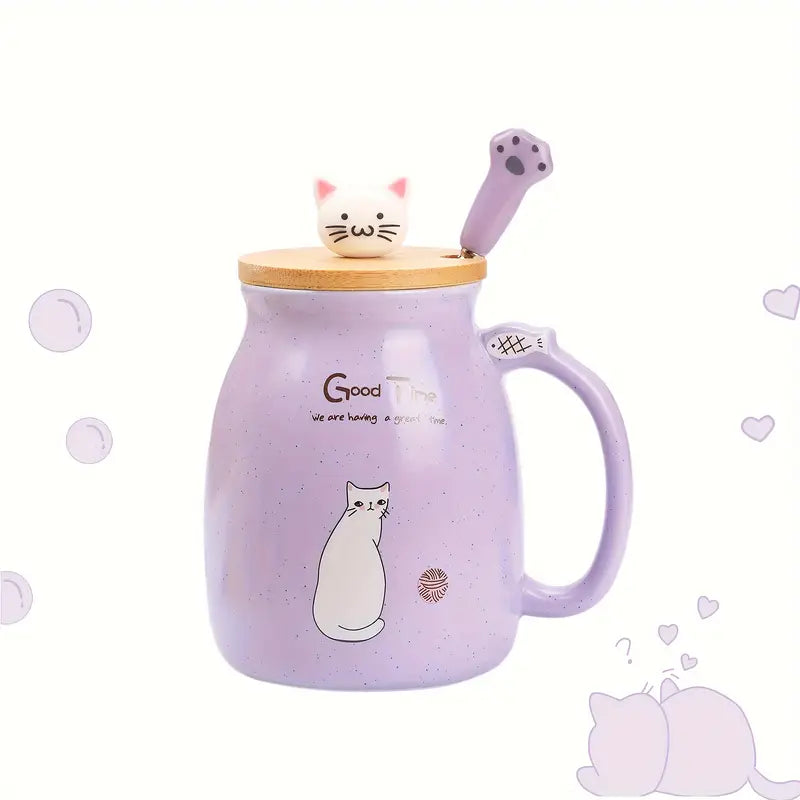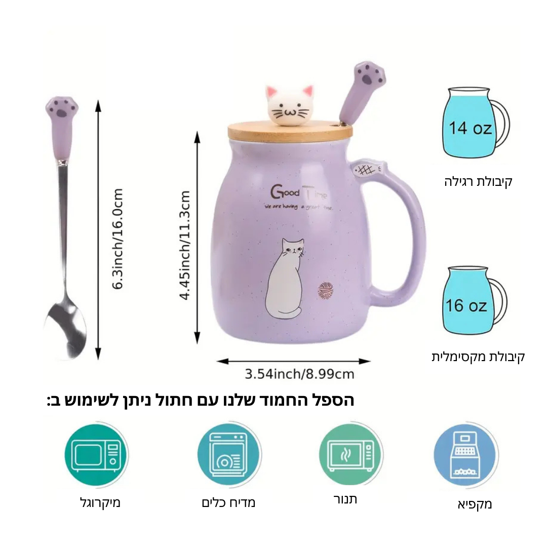 החבילה כוללת: 1 ספל קרמיקה חתולי, 1 מכסה, ו-1 כפית.