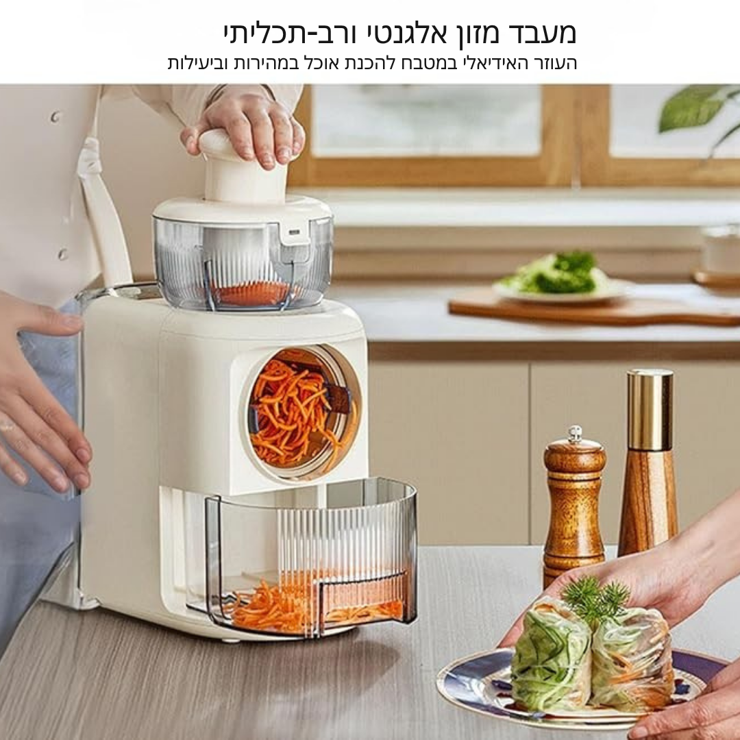 ™Slicero | מגרדת וחותכת חשמלית, 4 להבים מסטנלס סטיל, מכין סלט לפירות, ירקות וגבינה
