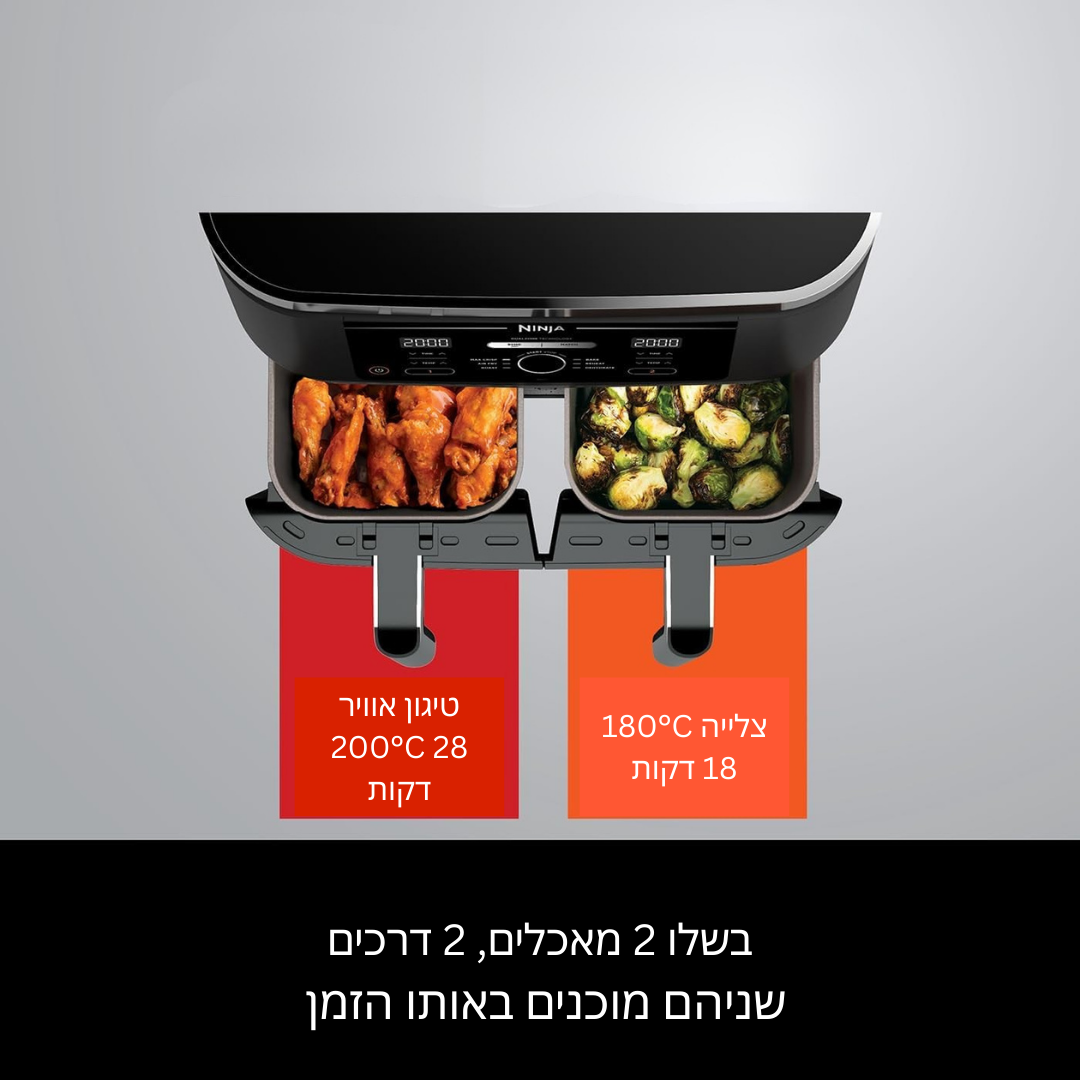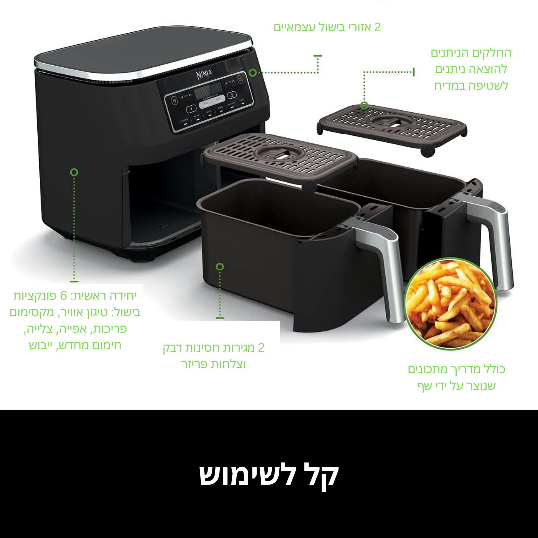תכולת המשלוח: טיגון באוויר דו-אזורי נינג'ה (שקע בריטי), 2 מגירות חסינות דבק לשטיפה במדיח (4.75 ליטר כל אחת, סך הכל 9.5 ליטר) & צלחות פריך, חוברת מתכונים. משקל: 8.9 ק"ג. צבע: שחור.