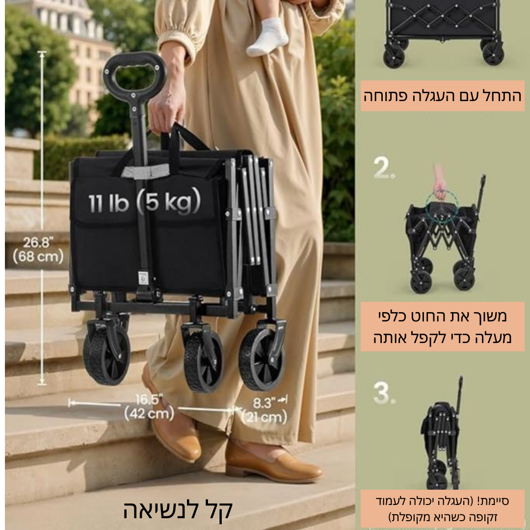 ™Zavron משלבת בין עמידות גבוהה לפרקטיות מתקפלת. בין אם זה לקמפינג, גינון או קניות – העגלה מתמודדת בקלות עם המשקל ומתקפלת בצורה קומפקטית לאחסון.